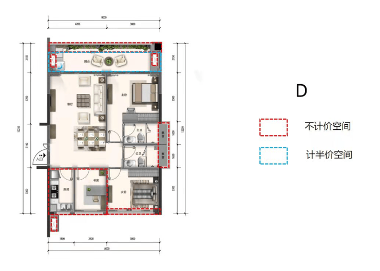 D户型 3房2厅2卫1厨 建面约91-99㎡