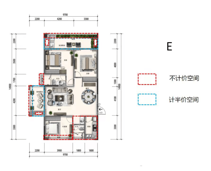 E户型 3房2厅2卫1厨 建面约110-122㎡