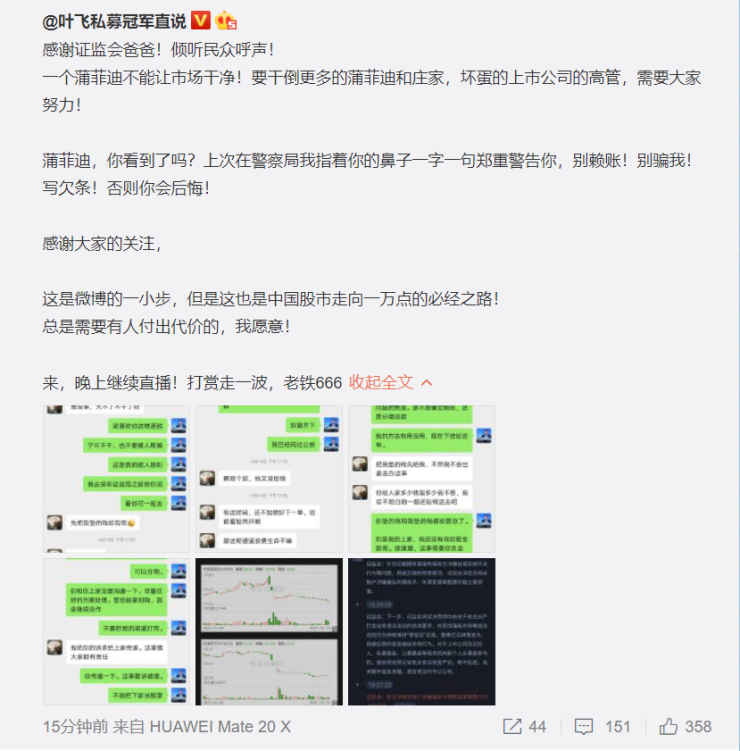 曾经的私募圈大佬也是微博百万粉丝大V叶飞,被逼无奈,爆料上市公司“中源家居做“市值管理”找的操盘方“赖账”。