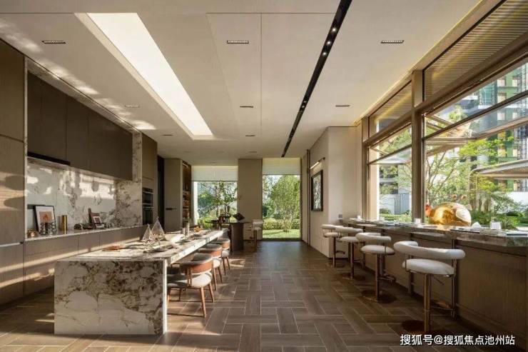 门庭。这里特指单元门庭,通高约4m,气势恢宏。大面积的金属屋檐外挑,彰显贵胄的同时,又扩大遮风挡雨的面积。进门左侧,色彩饱满的普拉达绿竖版镶嵌,美学传达与奢华品质相辅相成。进门后,又是大幅岩板上墙,气质拉满。