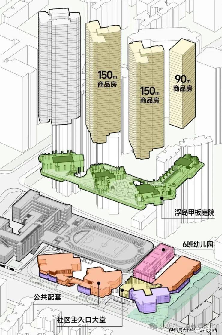 项目创新性地提出“浮岛甲板”设计概念,将四栋住宅建筑坐落于架空的三层绿化甲板之上,底层打造立体花园与共享会所,通过垂直分层实现动静分离,让“城市会客厅”融入居住空间,形成“超级社区底盘+浮岛绿化甲板”的垂直共生体系,解决了高密度城市环境中的绿化需求。