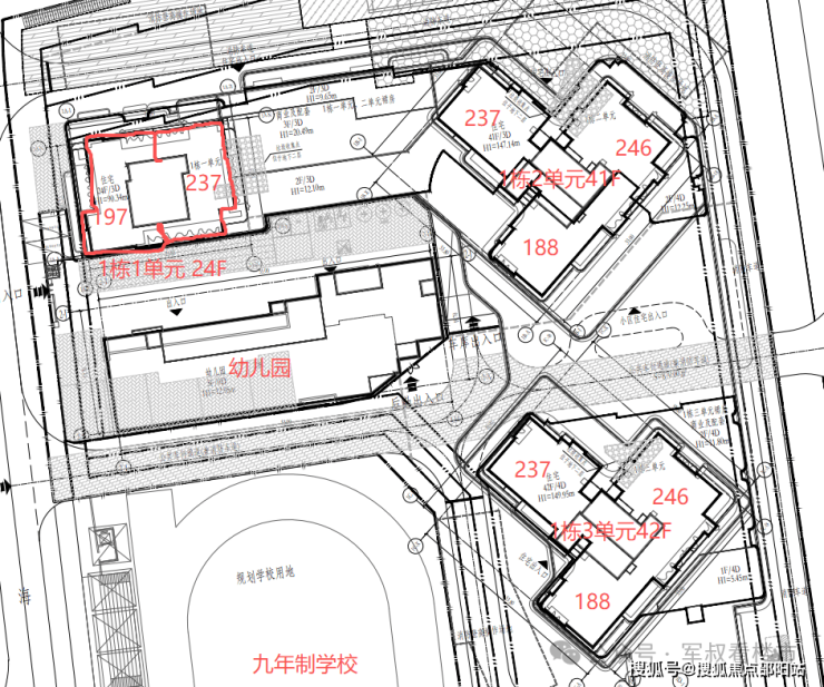 项目由4栋住宅和1栋幼儿园组成,其中有栋是25层板楼,南北通透;2栋T3排布41-42层超高层,一户一梯,南向270°全景舱;还有1栋是46层的小户型产品(户型暂未公布)。