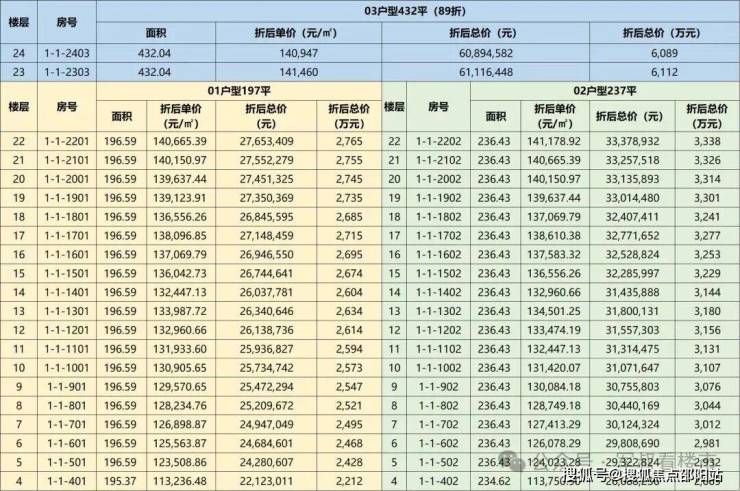89折后197平最低单价11.3万,总价2212万,237平折后最低单价11.3万/平,最低总价2669万(折扣表详细见下表)