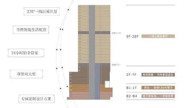 其中,2-7层是商务办公,9-28层为一线江景会客厅,配置了智能停车、智能梯控等标杆级资源,高定版品质生活在这里只是标配。