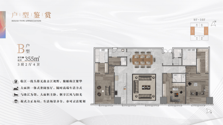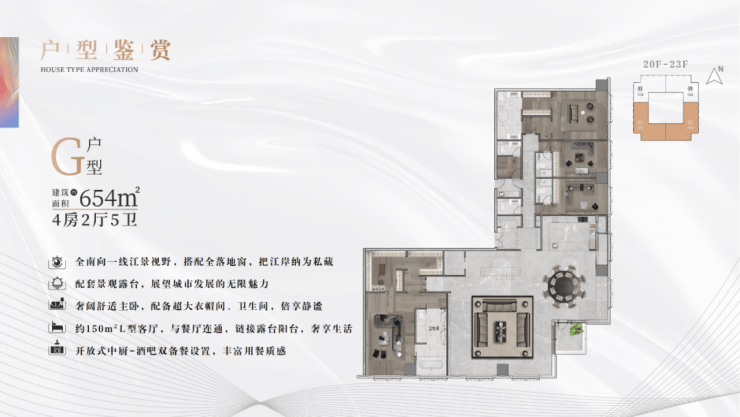 目前,项目主推377㎡、572㎡两个户型,全盘仅有96席,均拥有超大面宽及头排南向江景,满足塔尖人士尊贵奢华的多功能要求。