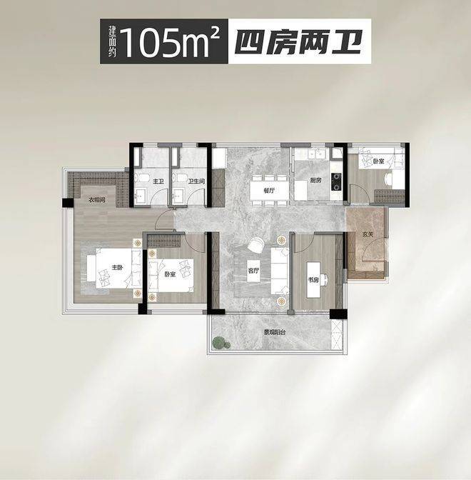 建面约105㎡四房两卫(高层户型):单边户设计实现南北通透,穿堂风与阳光自由穿梭,搭配3.15米层高,空间通透感十足。该户型做到了105㎡四房布局,轻松满足三代同堂家庭的居住需求,一步到位无需换房。户型布局规整,动静分区清晰,客厅开间开阔,连接南向阳台,采光通风俱佳;卧室尺寸充足,主卧配备独立卫生间与飘窗,保障居住私密性与舒适度,是刚改家庭的优选户型。