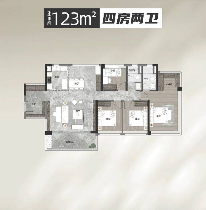 建面约123㎡四房两卫(高层户型):该户型空间尺度升级,居住体验堪比144㎡大宅,品质感拉满。全南向设计搭配充足采光面,每个卧室都可轻松放下1.8米大床,三代同堂居住也互不拥挤。客厅与餐厅空间开阔,搭配南向阳台,视野极佳,适合家庭聚会与日常休闲。户型收纳空间充足,细节设计贴心,卫生间干湿分离,厨房布局合理,兼顾实用性与舒适度,适配改善型家庭需求。