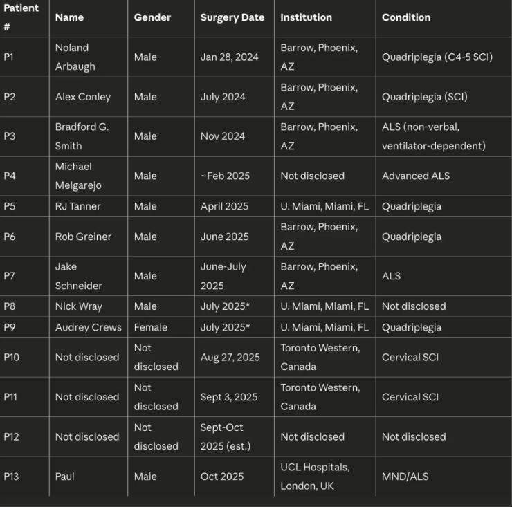 截止目前,Neuralink已完成13例脑机人体植入手术。在公开的术后视频中,脊髓损伤、渐冻症等患者展示着脑控机械臂进食、意念打字等超常动作。“从科幻走进现实”,成了这家企业最直观的标签。