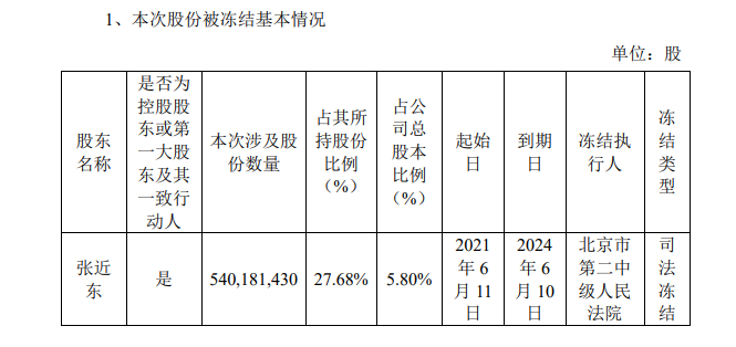 焦点财经讯 耿宸斐 6月15日,苏宁易购集团股份有限公司(SZ:002024)发布公告称,张近东被北京市第二中级人民法院冻结约5.4亿股股份,占公司总股本比例为5.8%,占其所持比例的27.68%。