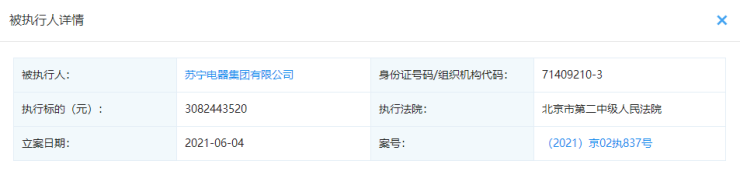 6月9日,苏宁电器集团有限公司新增一条被执行人信息,执行标的超30.82亿元,执行法院为北京市第二中级人民法院,案号为(2021)京02执837号。据中国执行信息公开网上显示,张近东、苏宁置业集团有限公司、苏宁电器有限公司均为被执行人,立案时间为6月4日。