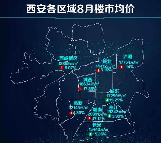 其中曲江一期板块环比下跌5.89%,科技路板块环比下跌4.76%。而泛高新板块环比上涨24.06%,电视塔板块环比上涨18.13%。