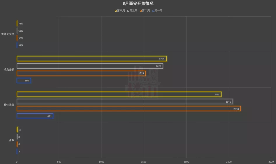 8月供应大增,有2个方面的因素存在:一是9月全运会期间对预售证发放的控制,有些项目符合拿证条件的就提前发放;二是市场态势转变,为9、10月传统销售旺季存货。自7月的二手房指导价后,在8月底又丢出深水炸弹,先是收回价格备案公示权,接着就是限购升级,沣西2个街道以及能源金贸区纳进限购区,以及新落户买2套、假离婚腾房票、人才购房都漏洞打补丁。