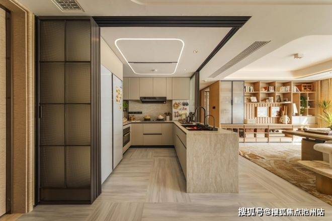 120㎡户型硬装设计以咖色为基调,定制铸铝入户门+分体式智能门锁,厨房电器齐全冰箱、油烟机、灶台、洗碗机、烤箱、水槽,大尺度操作台,调味拉篮、台上层架收纳;围绕“取-放-洗-切-烹-盛”的流程闭环设计,结合系统化收纳配件让每一寸空间都高效、便捷、清晰地为烹饪流程服务。119㎡户型采用浅色木饰面与潘多拉岩板的独特花色相互交融浑然天成,将客厅与多功能室、厨房空间打开,动线洄游,空间视觉开敞;以原木色作为空间的主题色,竖纹地砖横竖有序铺贴,贯穿地面,形成连续的视觉流线,延伸空间。