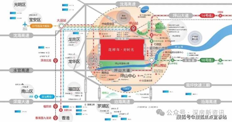 花样年好时光,位于坪山区东纵路与金碧路交汇处,位居坪山区中心城区核心地段,毗邻地铁14/16号线换乘站坪山围站(步行约200米),是双地铁覆盖的TOD综合体项目。