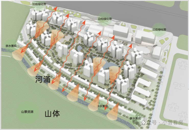 项目的楼栋设计十分注重南向河景+山景的搭配,从而提升项目的景观价值。