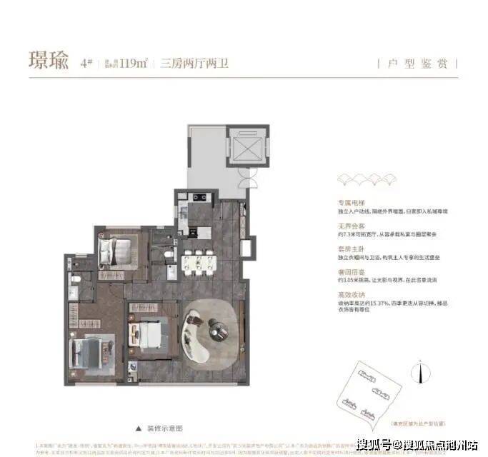 该户型带独立电梯前室,两个卧室能做到270° 景观视野,大概率也是双面飘窗。不过,南向次卧卫生间是暗房,南向次卧外有空调机位,按照户型图显示会一定程度遮挡采光(实际情况待定),餐厅位于户型中部,采光较弱。