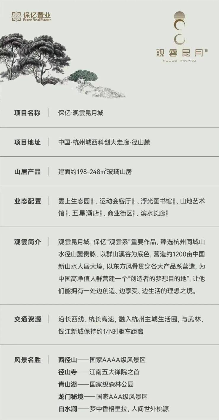 在那远古的晨曦之前,山林,这片未被尘世喧嚣触及的净土,悄然孕育了人类文明的初芽。山峦叠翠,云雾缭绕,月光如洗,李白笔下的仙境与陆羽品茗的幽静,仿佛在这无垠的绿意中找到了永恒的归宿。而今,保亿·观雲昆月城,于天下径山之巅,以一幅跨越时空的“未来山居画卷”,重新定义了人与自然和谐共生的理想境界。