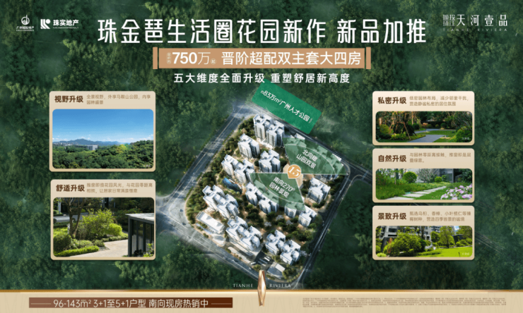 城投珠江·天河壹品(备案名:德荟花园)位于广州天河金融城生活圈核心,由广州城投与珠江实业两大国企联合打造。项目总占地约5.16万㎡,总建面约22.89万㎡,容积率3.01,规划21栋13-14层低密小高层住宅,总户数1518户,车位配比1:1.2。产品主打建面约86-143㎡的3+1至5+1房,采用新规设计实现超90%的使用率,层高3米,部分户型配备双主套与270°环幕飘窗,全屋智能化交付,二期已于2024年11月提前交付。