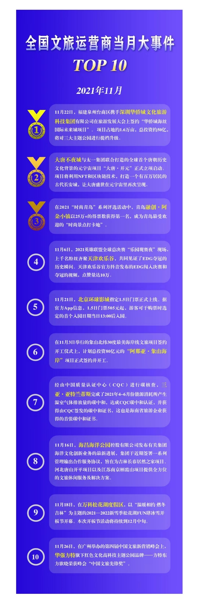 本月,各文旅运营商们延续了10月以来在逆势中迭代进化、破旧立新的表现,在年关将近之际依然保持着进取欲与探索力。其中,既有对于新项目的探索,如异地扩张的“阿那亚·象山海岸”,亦有对于新概念、新热点的探索,如开创排名前列“大唐元宇宙”的大唐不夜城以及将欢乐文化与电竞文化融为一体的天津欢乐谷。基于此,本月我们将重点解读具有自我革新力的文旅运营商,试图探究其如何在不同领域突破自我、锐意革新。