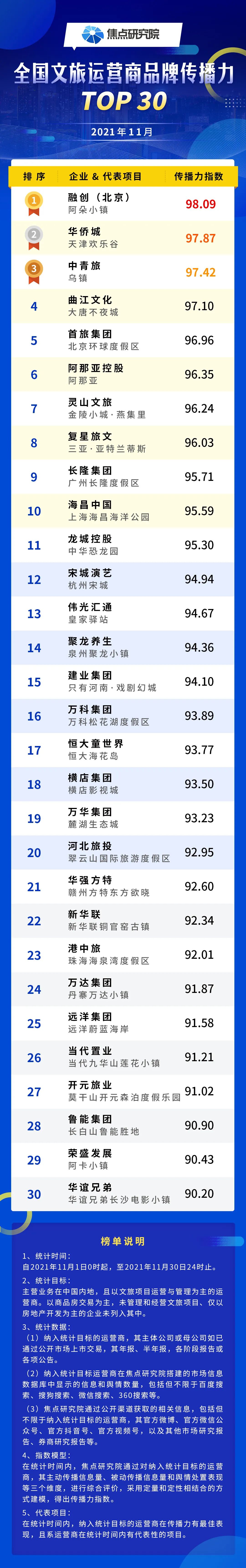 11月,文旅运营商品牌传播力TOP30榜单中排名前五的运营商依次为融创北京(98.09)、华侨城(97.87)、中青旅(97.42)、曲江文化(97.10)和首旅集团(96.96)。本月,融创北京区域集团凭借阿朵小镇开业两月以来的蓄势赋能,首登品牌传播力TOP30榜单榜首。华侨城凭借“海丝未来城”落地泉州台商投资区以及旗下欢乐谷集团在进博会上与加拿大SimEx签订战略合作协议等“大手笔”,在榜单中位居次席。中青旅、曲江文化和首旅集团也继续良好表现,分列榜单三至五位。复星旅文、海昌中国凭借在轻资产管理输出、绿色发展等方面取得的突破性成果,强势跻身榜单10强。此外,万科松花湖度假区2021-2022雪季鸣枪开板,助力万科首次进入榜单20强。