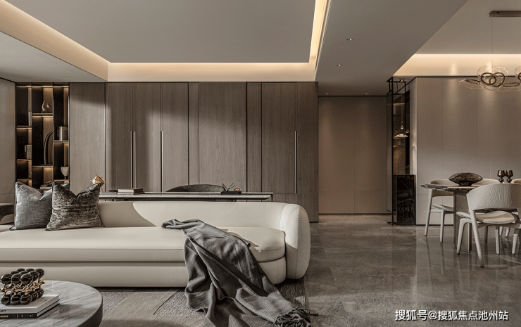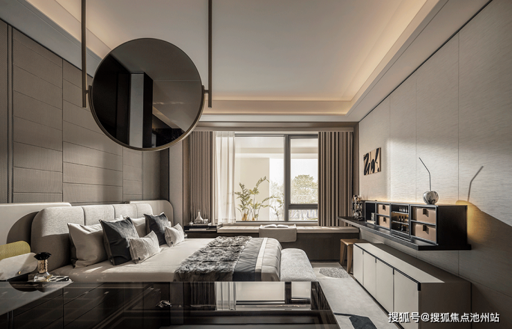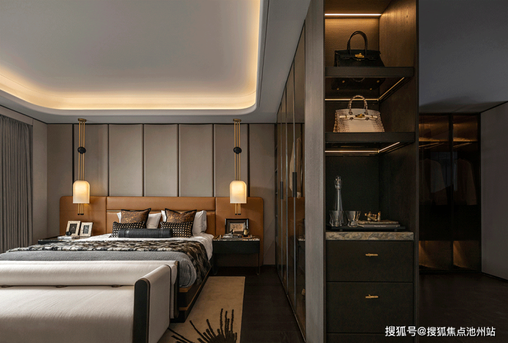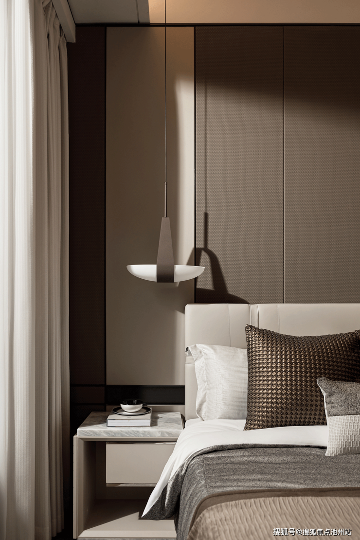 主卧更像是主人的一隅独立天地,内设独立的衣帽间和盥洗室,天花柔和的弧角温润亲和,背景墙的编织皮革似在雕刻时间的肌理,令空间产生熨帖身心的舒适感。