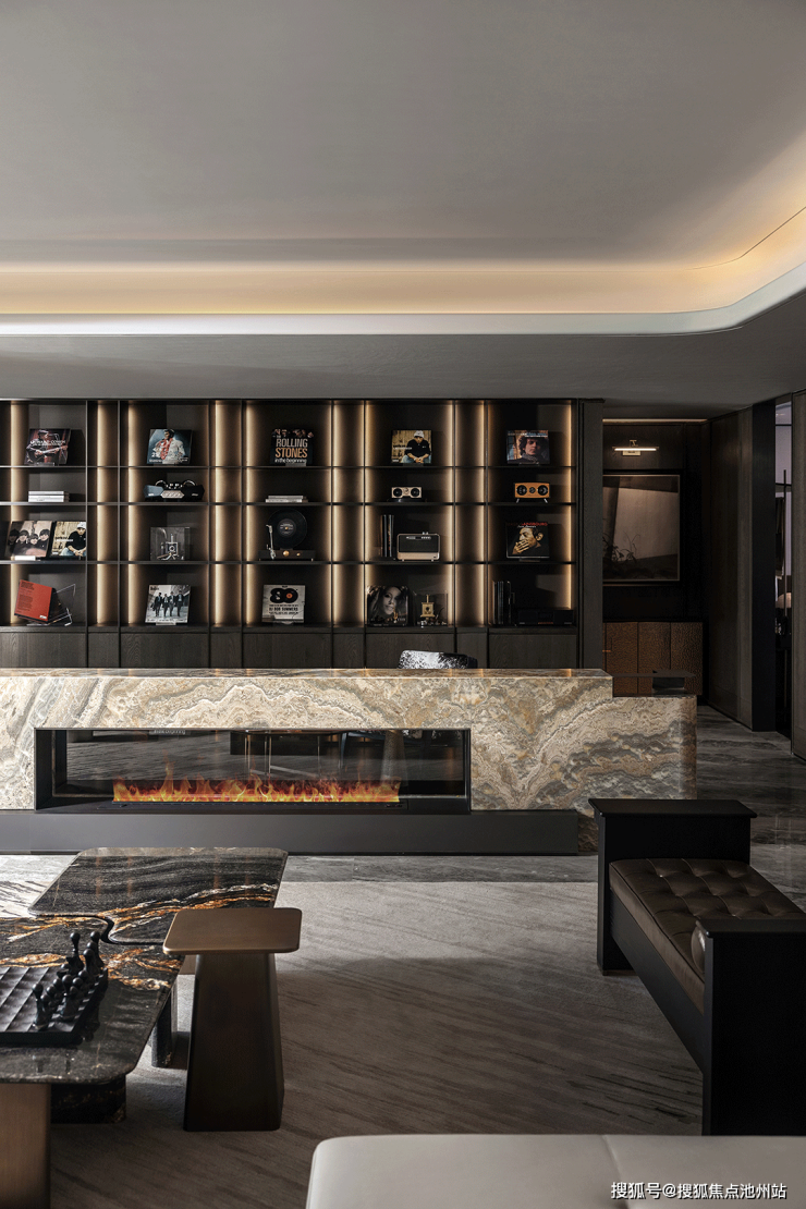 走廊使室内诞生一条可自由行进的甬道,纵深感随之而来。壁炉墙与人的腰身齐平,恰到好处的放缓空间节奏,强化主厅空间感。