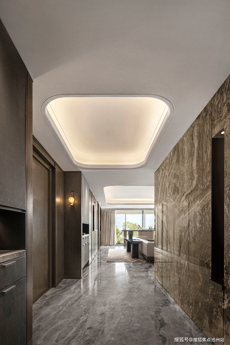 步入室内,玄关迎面而来的水墨奢石彰显气度非凡,石材的厚重被江南烟雨的温润所软化,奠定空间的整体调性。