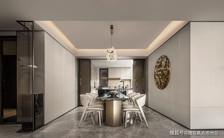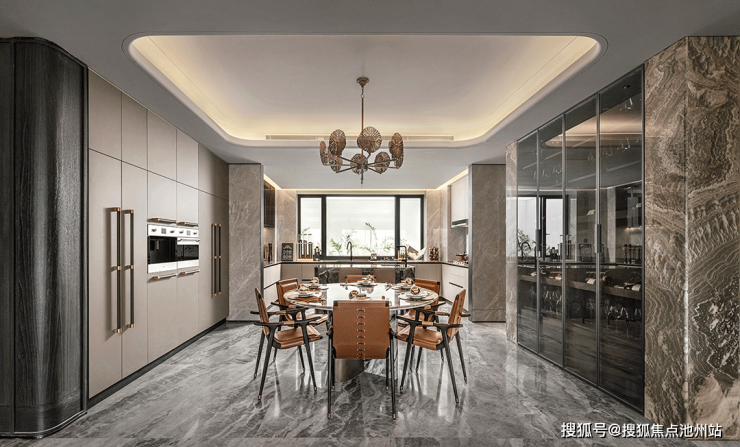 基于LDKB的布局,家人们共享整个空间,生活中的交互或社交时的沟通都可以轻松展开。餐厅右侧西橱柜嵌入玄关奢石,一体化的形式下更添品质属性。