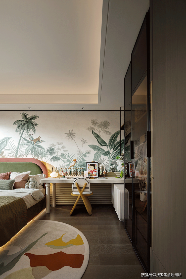 女孩房主题以绿色为色彩基调,用森林自然为空间基底,呼应客厅空间的设计调性,色彩缤纷的热带雨林里,童趣盎然。