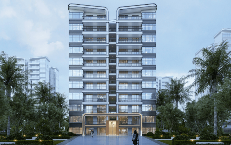 项目采用现代建筑风格设计,主题色调为浅深搭配,简洁大方,屋顶采用圆角形式,具有独特的现代感。用材上方面,整体墙面采用浅色调真石漆,搭配深灰色线条,局部门头采用金属色泽,强调出入口。装饰方面,整体协调、细节精致、舒适自然,符合现代建筑审美。套内以起居室为中心,内部动静分离、洁污分离、走廊短捷、布局合理,提高得房率与舒适度。