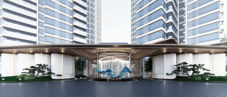 中建以“万舸争流”的巧思回应黄埔江岸的千年商港,并化为现实呈现,体现在延展约126米的城市级门楼上,气势恢宏。