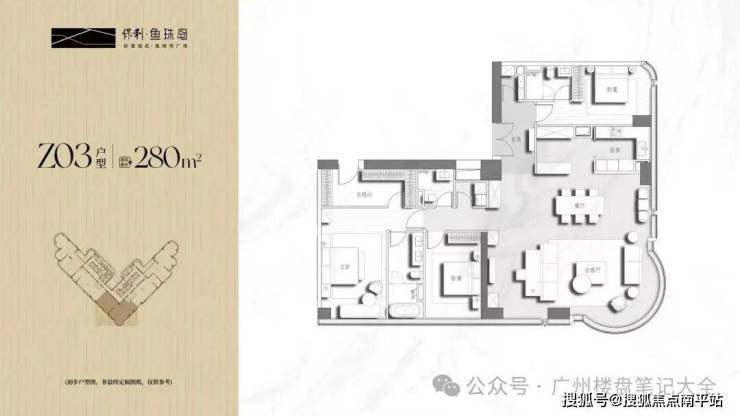 住宅4层起,户型分布,分成低区、中区、高区。 中区是6梯5户设计,户型为210㎡、220㎡、280㎡、340㎡、350㎡。 高区是6梯4户设计,户型是285㎡、330㎡、400㎡。