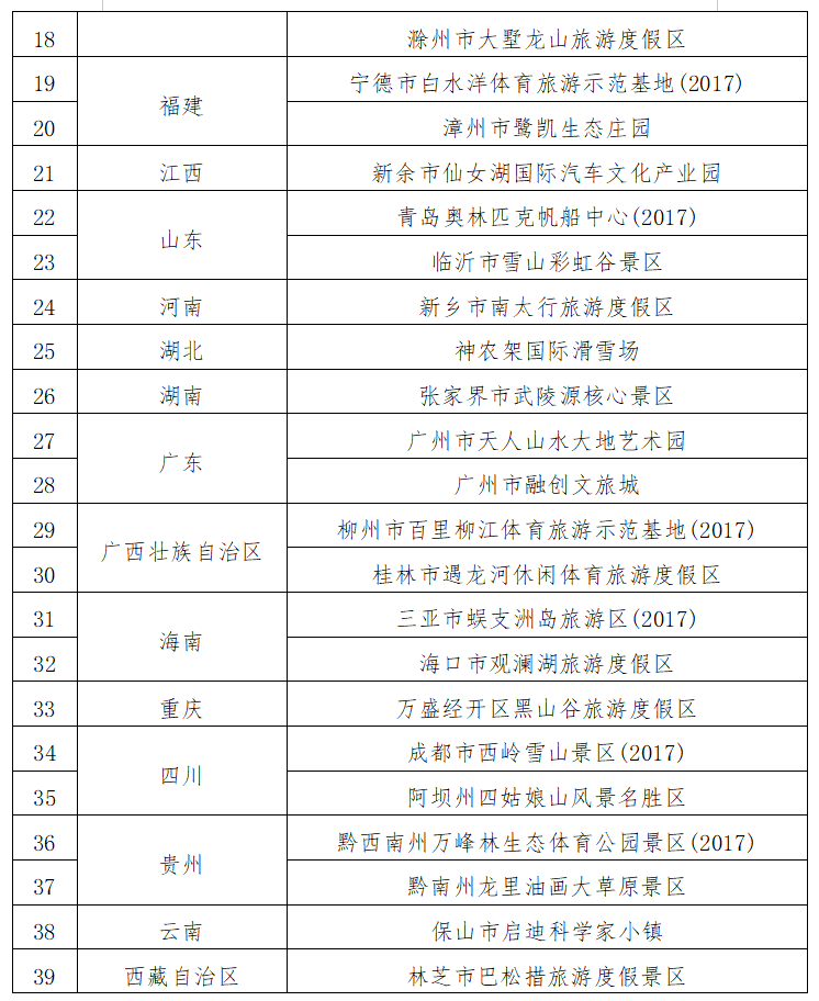 11月16日,体育总局办公厅、文旅部办公厅发布关于国家体育旅游示范基地公示。其中包括北京朝阳区北京奥林匹克公园、平谷区金海湖景区、天津滨海新区东疆湾沙滩景区、上海松江区佘山国家旅游度假区、浙江宁波市东钱湖旅游度假区、广州市融创文旅城等47家国家体育旅游示范基地。