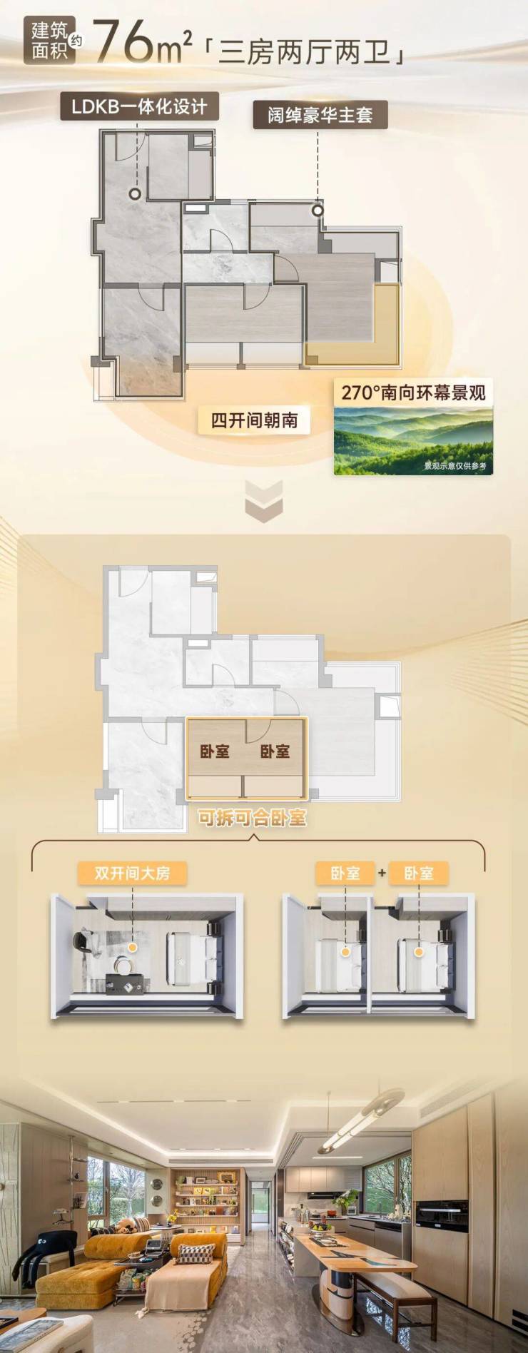 除了王炸户型,本轮加推还有5栋05单位约76㎡户型,能眺望城市山景,推窗见绿。