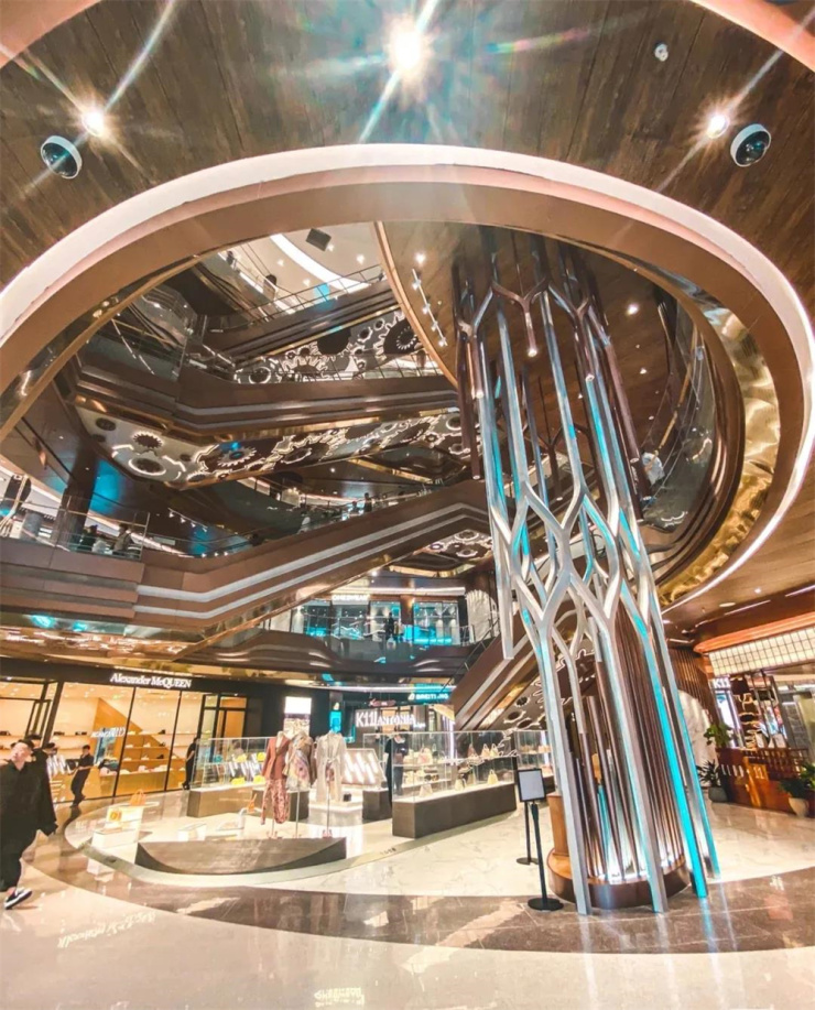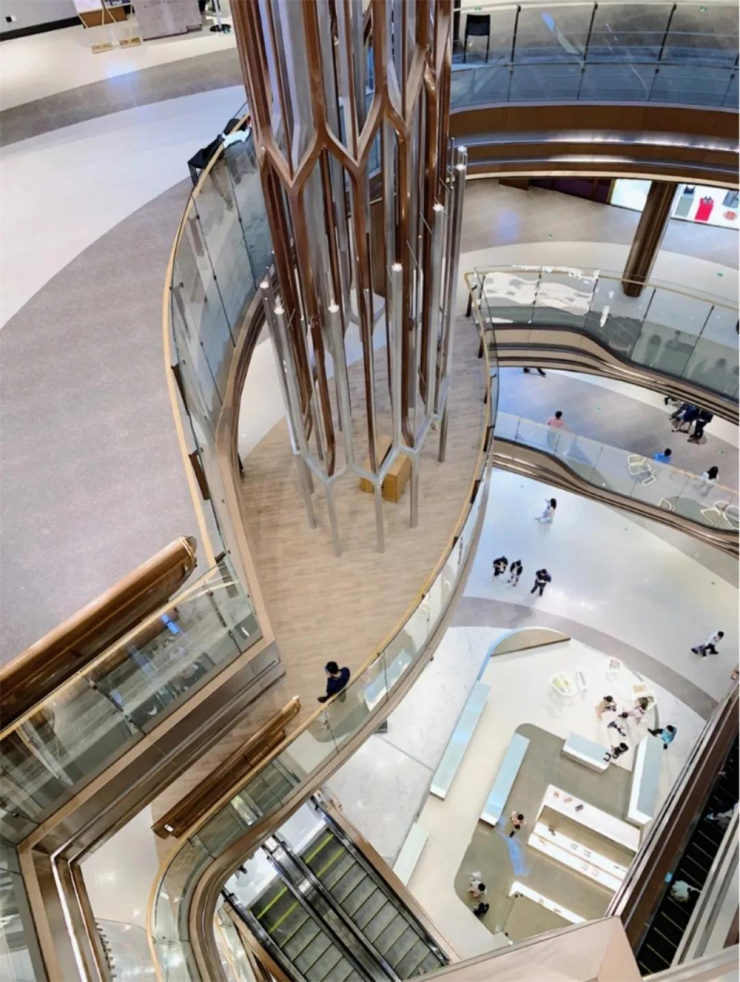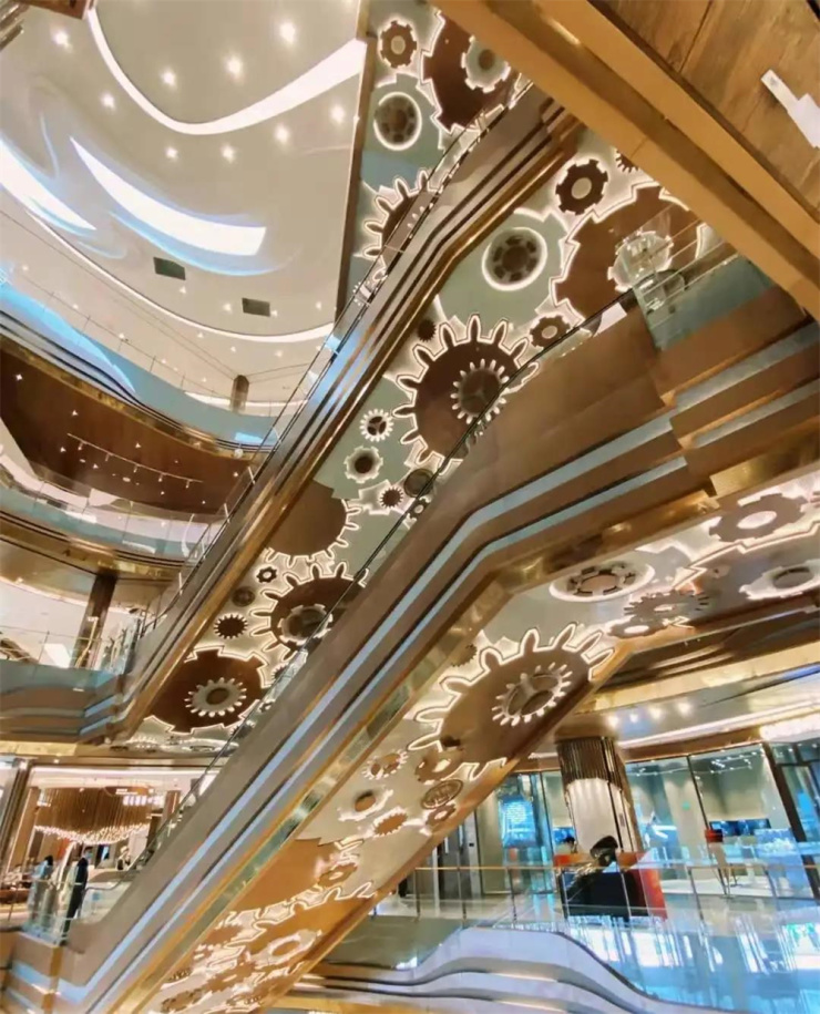 每层扶梯底部被做成齿轮造型,配合极具旋律感的金属围身和以芭蕾舞者裙摆的优雅线条为概念的地面、天花设计,带来极强的视觉美感和画面张力。