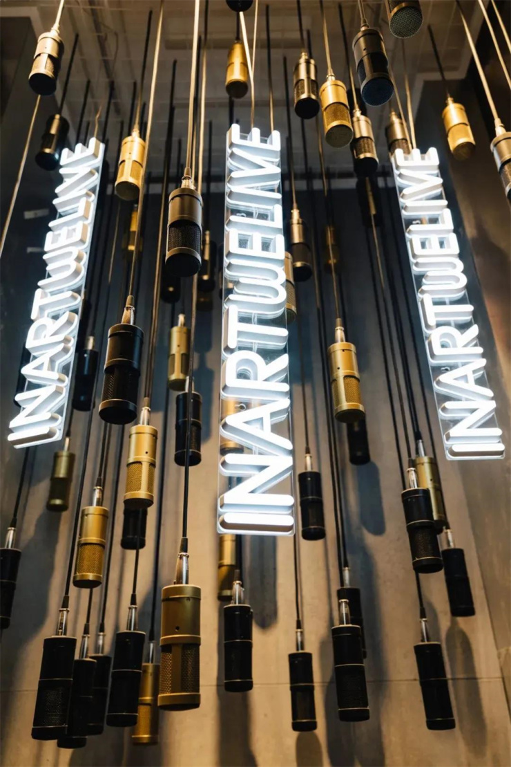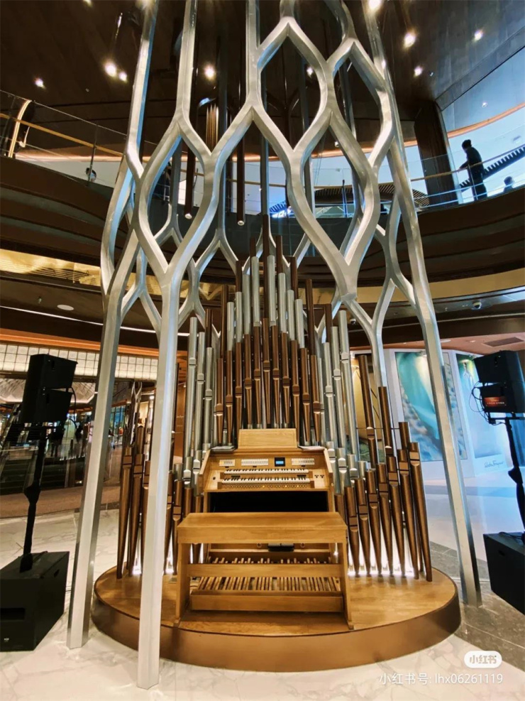 进入中庭,首先映入眼帘的就是从一楼直达顶层的巨型管风琴装置。流线型的护栏与灯带如同扩散开来的音波,鎏金材质和流畅的线条营造出强烈的旋律感。
