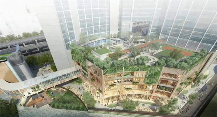 HK1外围:主入口、幕墙、地面、空中连廊和慢行街区。