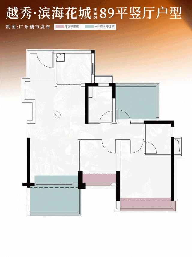 约89㎡三空间两厅两卫,南向三面宽采光面,敞亮通透,超10.6米的超级S墙,整墙强收纳