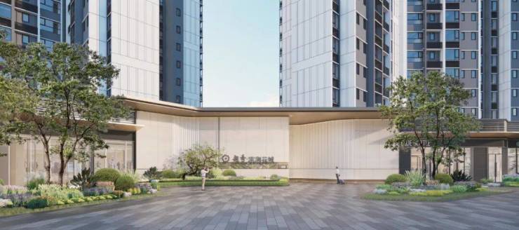 小区采用星级酒店门楼,尊崇仪式感,超31米宽奢华酒店式门楼,搭配莫奈森林石材与贝金米黄奢石。