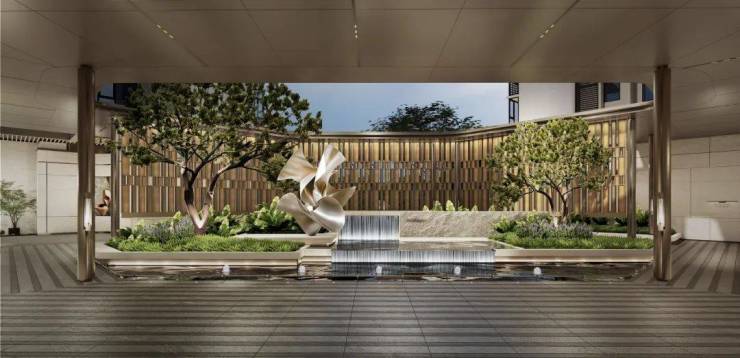 还有迎宾水幕,寓意万紫千红,艺术雕塑搭配蓝翡翠仿石砖+冬青树,荔枝纹锻金弧形屏风&风雨连廊