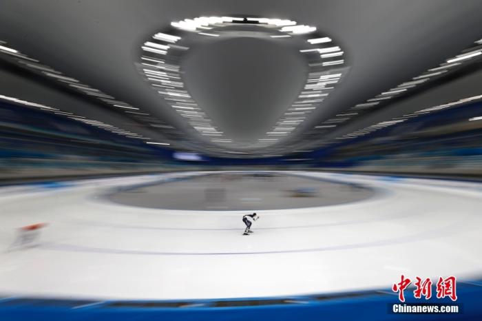 10月8日,首场北京冬奥测试赛——“相约北京”速度滑冰中国公开赛在国家速滑馆“冰丝带”举行。本次比赛持续3天,设12个小项,有来自中国、韩国、荷兰的运动员参加比赛。图为女子3000米比赛。 中新社记者 富田 摄