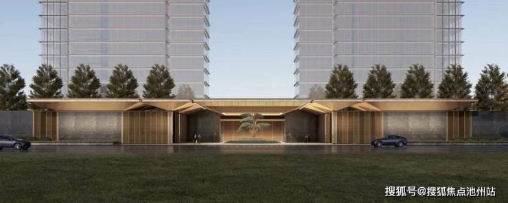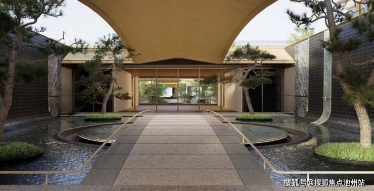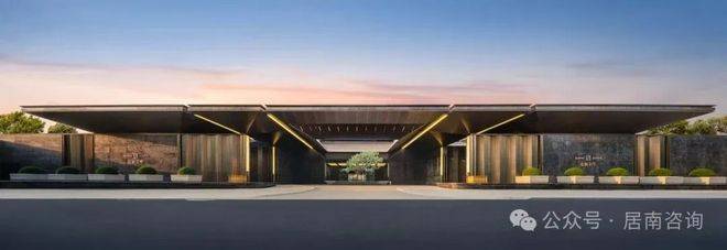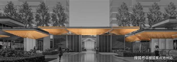 南入口门头尺度高约8米、宽约100米,列阵仪式感强。一路归家动线,将穿过落客前庭,再进大堂门仪,穿越浅坡中庭、经纬归堂,各个楼栋,都由风雨连廊体系进行串联,最终串联至入户系统。