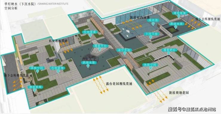 金陵月华的下沉式庭院,是目前绿城产品体系中最大的下沉空间模块。它不仅是一个娱乐场地,也可以是社交平台,还能与台地景观、观景平台、下沉式卡座等空间相互交错。