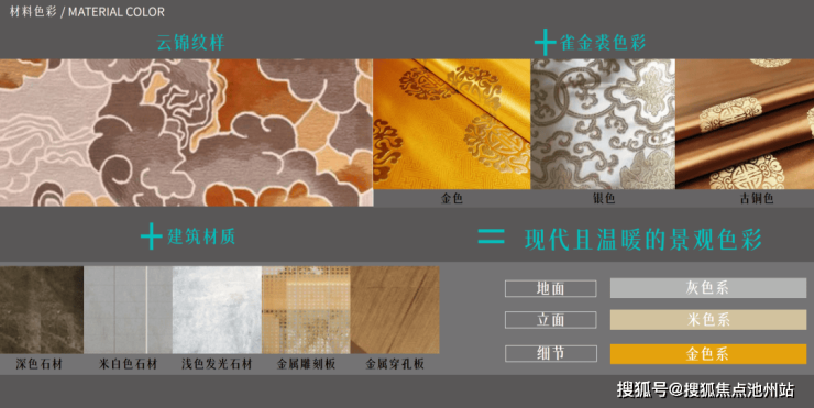 外立面为了达到云锦金丝感,选用暖灰色石材、香槟色金属、玻璃等材质,再现“灿若云霞、寸锦寸金”的绚烂观感,就像把云锦绣在建筑上!