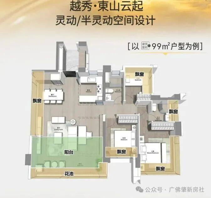 越秀·東山云起作为越秀区首个“新规”项目,阳台占比达20%,使用率超100%-120%,全南向设计,灵活可变布局,配备无柱阳台、入户花园等,空间利用率极高,适配中产家庭及改善型需求。创新采用垂直分区设计,基于社区生活会所化理念,打造了一个超级底盘,主推98-139㎡四房,至于价格方面: