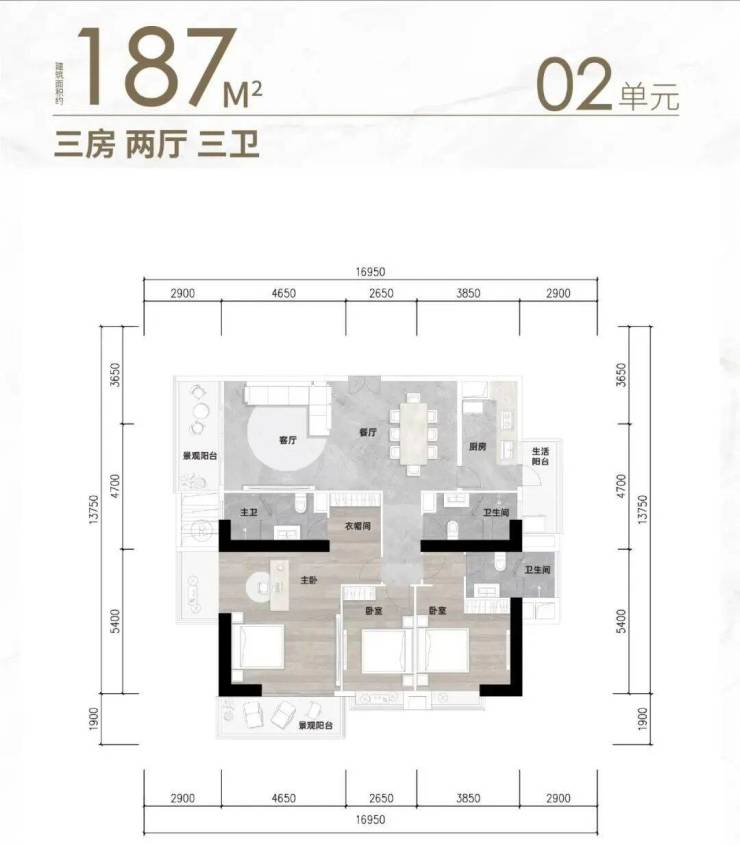 标准层面积:约620㎡ ,户型包括176㎡-187㎡-204㎡-257㎡三至四房