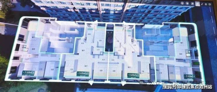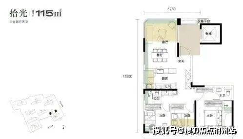 建面约115平的边套三房:分布在1号楼端头边户,3个卧室朝南,餐客厅一体全景舱设计,带独立电梯前室。该户型的结构是仿照豪宅设计的,但面积却非常小。优化面积主要来源于阳台和飘窗,部分空间阳台外部预计是有花池作为全赠送面积。