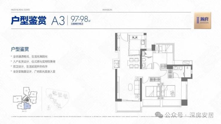 96-98㎡3房2厅2卫03/05/06(A2/A3)户型,设计的是经典竖厅三开间朝南格局,客厅3.5米开间,LDKB一体化,S墙设计预留冰箱卡槽位,主卧+1个次卧双飘窗。