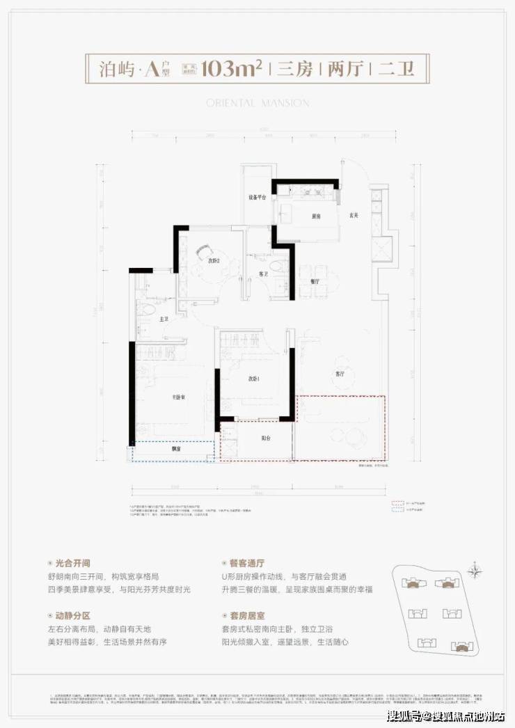 建面约103平,三房两厅两卫。三大亮点分析:①南向三开间,朝南次卧带阳台,客厅联通阳台后,空间阔绰;②U型厨房且半开放设计,玄关含S墙冰箱位,利用率高、采光更优;③新规户型得房率高达约90%以上。