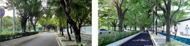 还人行道于行人。增加非机动车专属停车区域,整洁有序。配置智能降温装置、互动喷雾等智能街道家具,增加白天出行的清凉感。